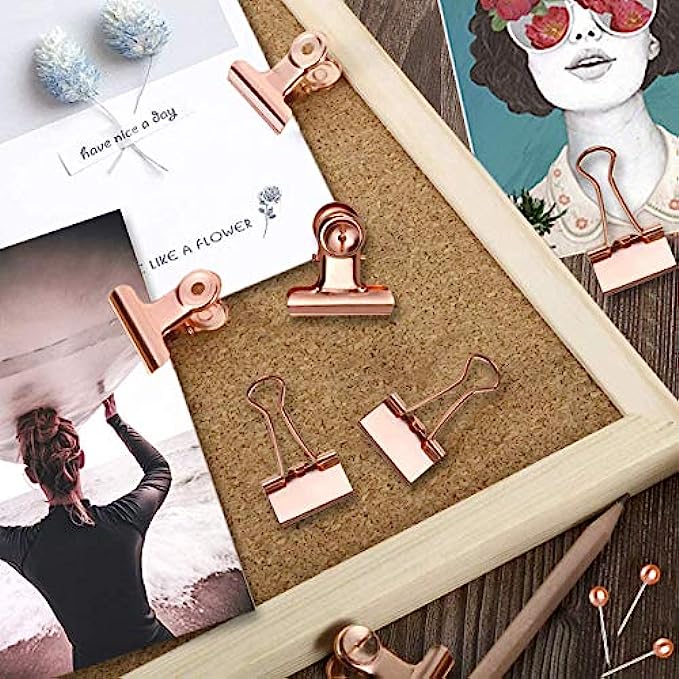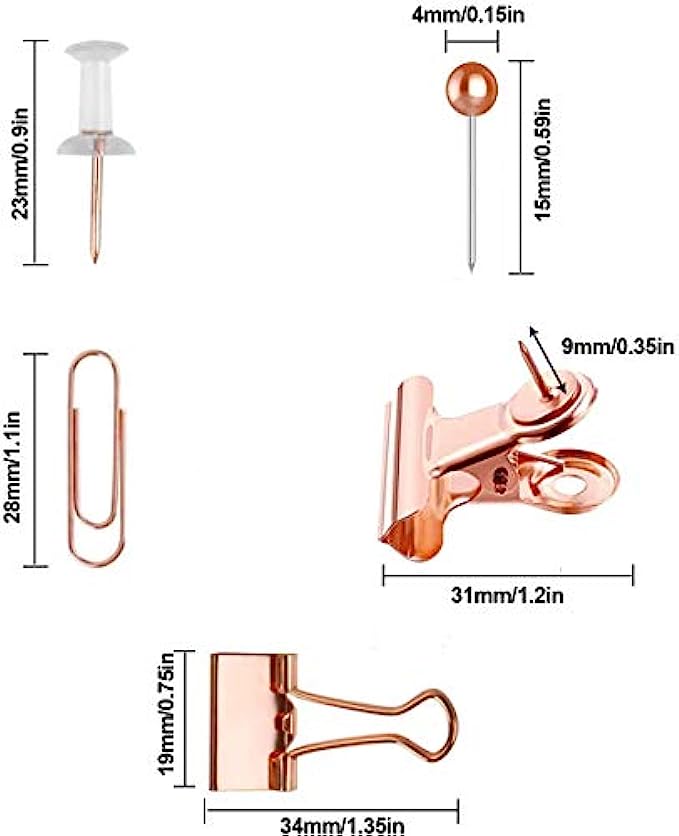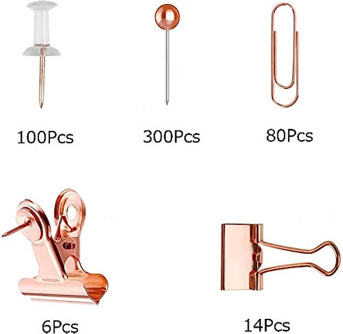 HQDeal 500PCS Rose Gold Office Stationery Set, 100Pcs Push Pins+80Pcs Paper Clips+300Pcs Round Head Pins+14Pcs Binder Clips+6Pcs Bulldog Clips with Push Pins Clips for Home School Office Supplies