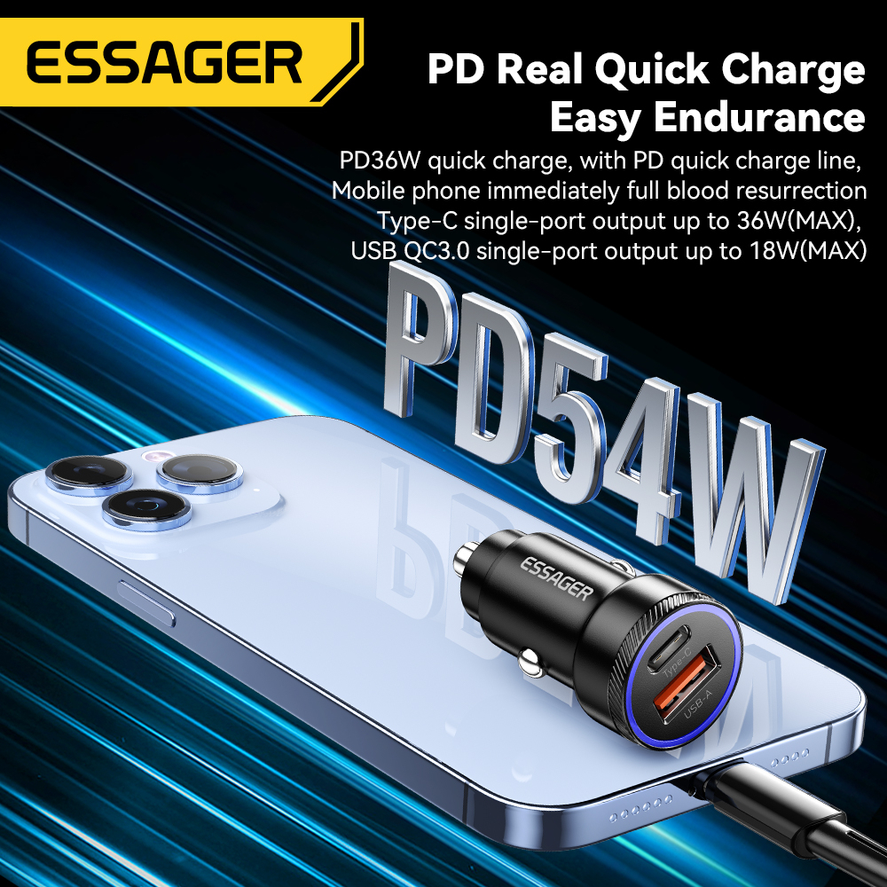Essager 54W LED Usb Type C Car Charger PD QC 3.0 Fsat Charging For samsung IP Phone 12-24V car charger