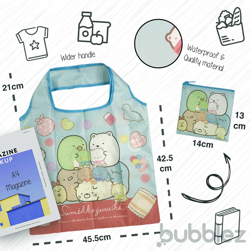 Suitable Occasion:groceries mktg/shopping; Ideal as gifts Suggested Look:vibrant color, cute design+ waterproof Styling:Kawaii reusable/recyclable eco bag Prompt delivery of order items-slightly exp. due to separate zip pouch & material seems sturdy & to load heavier stuffs up to 15kg as described!!>>as compare to the foldable bag w/zipper on top+w/ 2pockets@front(unfold)**better buy/practical/same price range in my opinion...