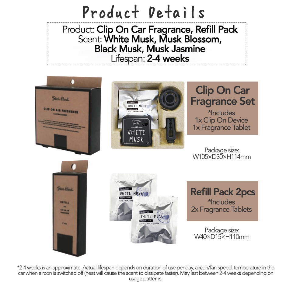 Suitability:For Aircon Vent Appearance:Nice Quality:Good Repeated purchase~ Prompt delivery. Nicely packed. Love the smell, find myself always coming back for it! ? Musk blossom is nice too, abittt more floral scent. But not overpowering type.