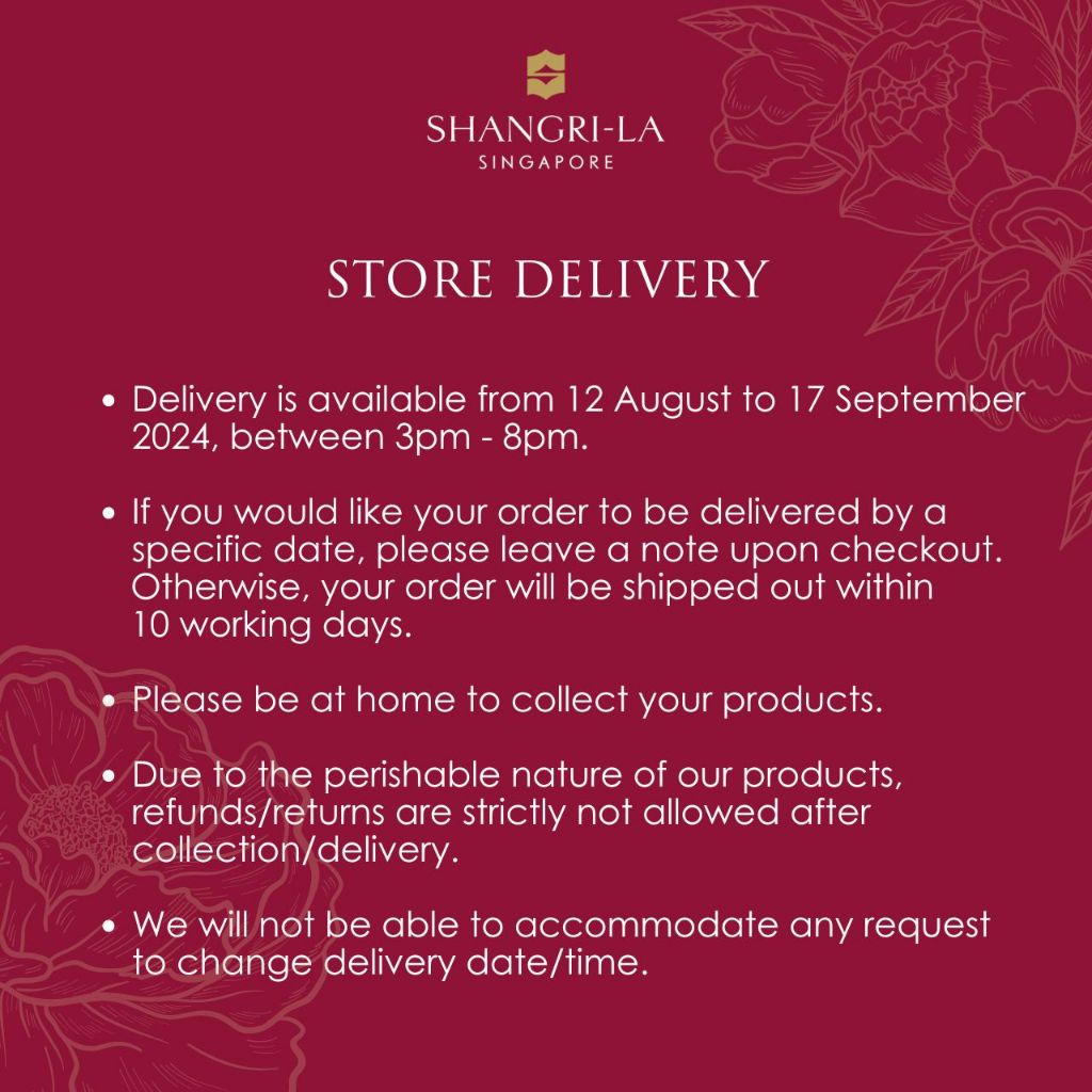 Quality:Very good Taste:Very nice Collection was impressively fast. Ordered on 9/8/24 and it was ready for collection on 11/8/24. This was meant for a foreign guest who is leaving on 13/8/24 morning flight and so the speed is greatly appreciated. Thank You very much Seller and Shangri-La for the fast work and great coordination.